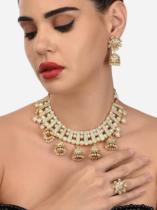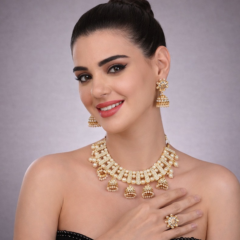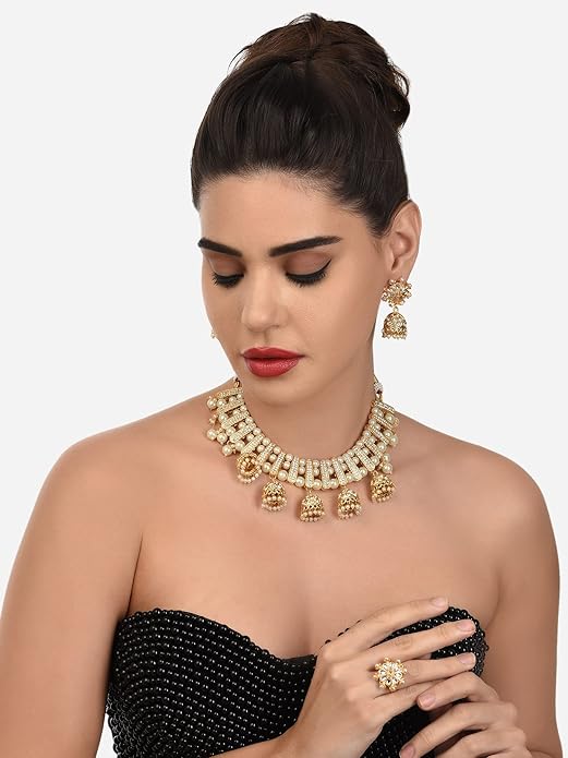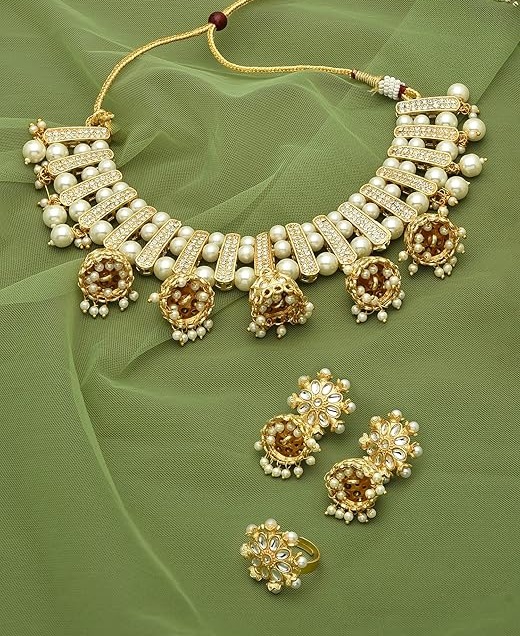 Includes necklace, 2 earrings, maang tikka and finger ring